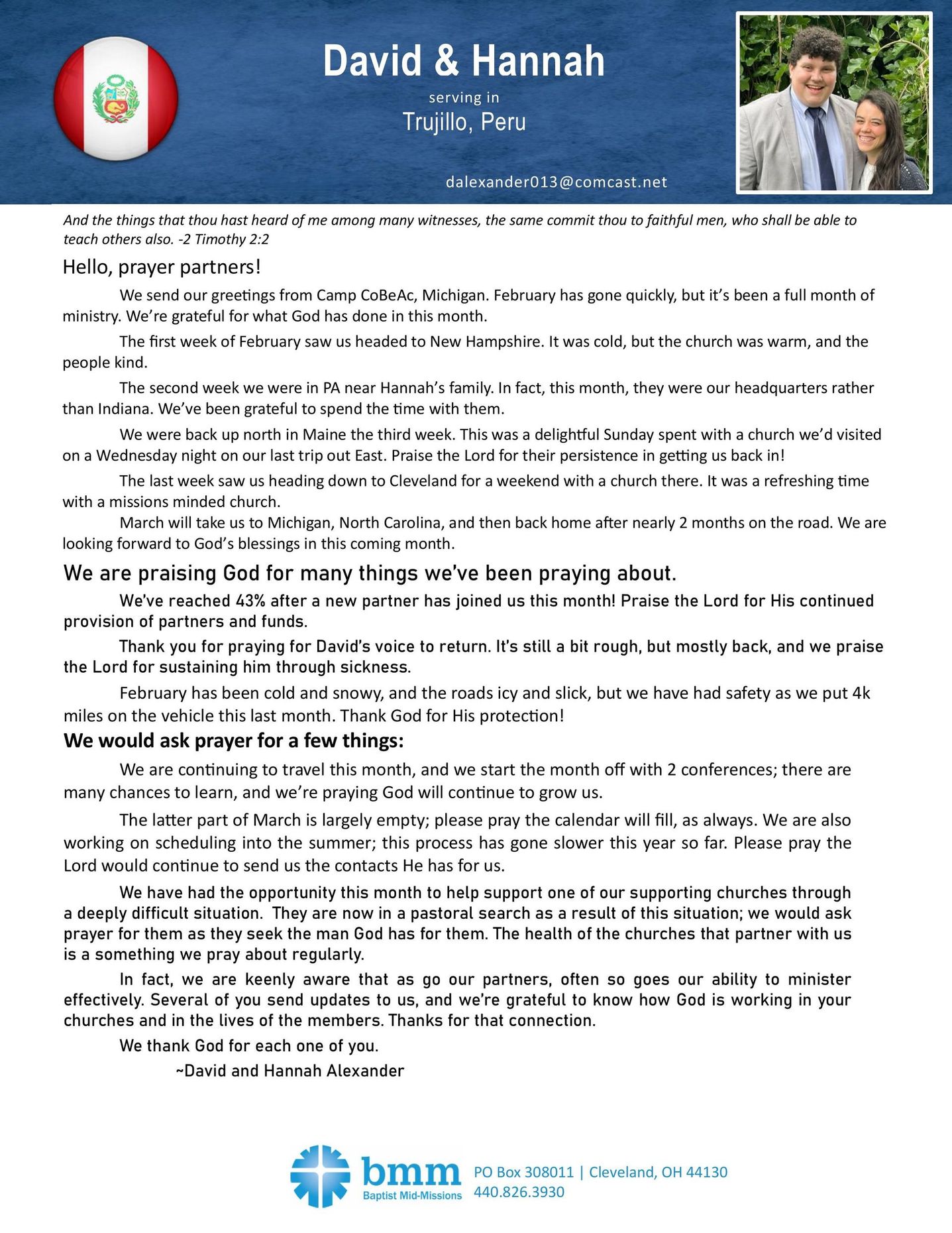 We completed a 5 month survey trip in 2024, and are now on full-time deputation with Baptist Mid-Missions as of July 2024. Our goal is to get on the field as quickly as the Lord would have us back. In order to do this, we need two things: